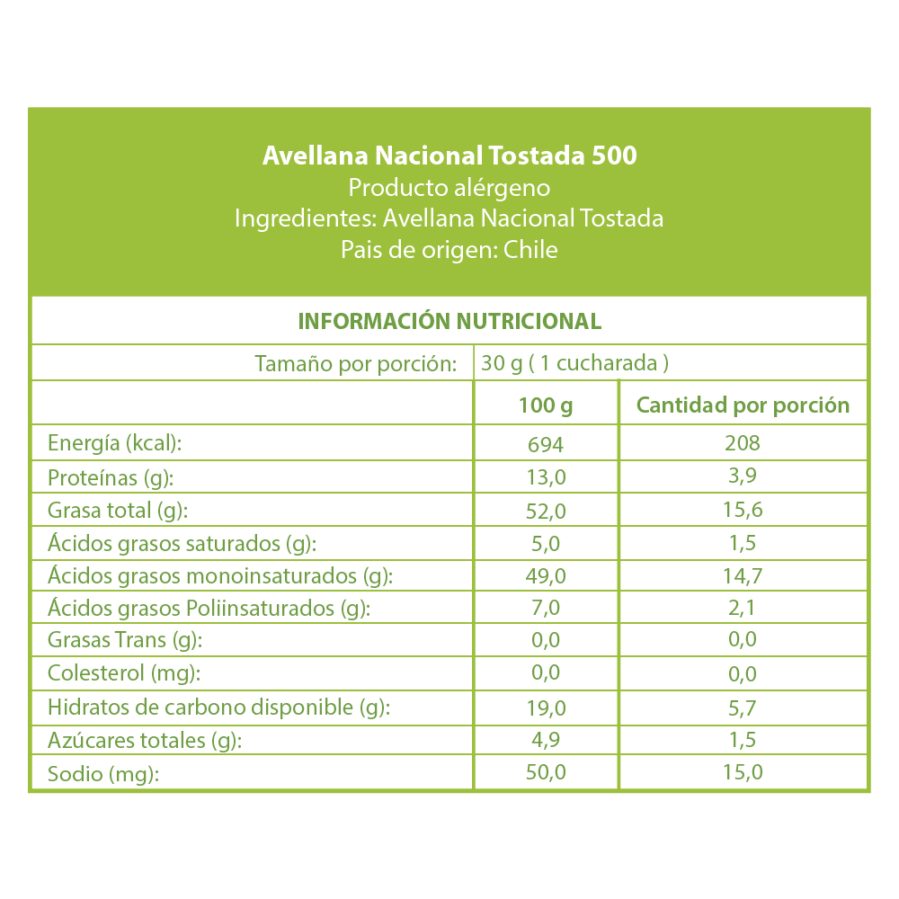 El perfil nutricional de la avellana se basa principalmente en su contenido de ácidos grasos, siendo el 82% aprox. de ácidos grasos monoinsaturados. Al respecto cabe señalar que estos ácidos grasos reducen el colesterol y los trigliceridos, ayudan a controlar la presión arterial, mejoran la sensibilidad a la insulina y benefician al corazón.