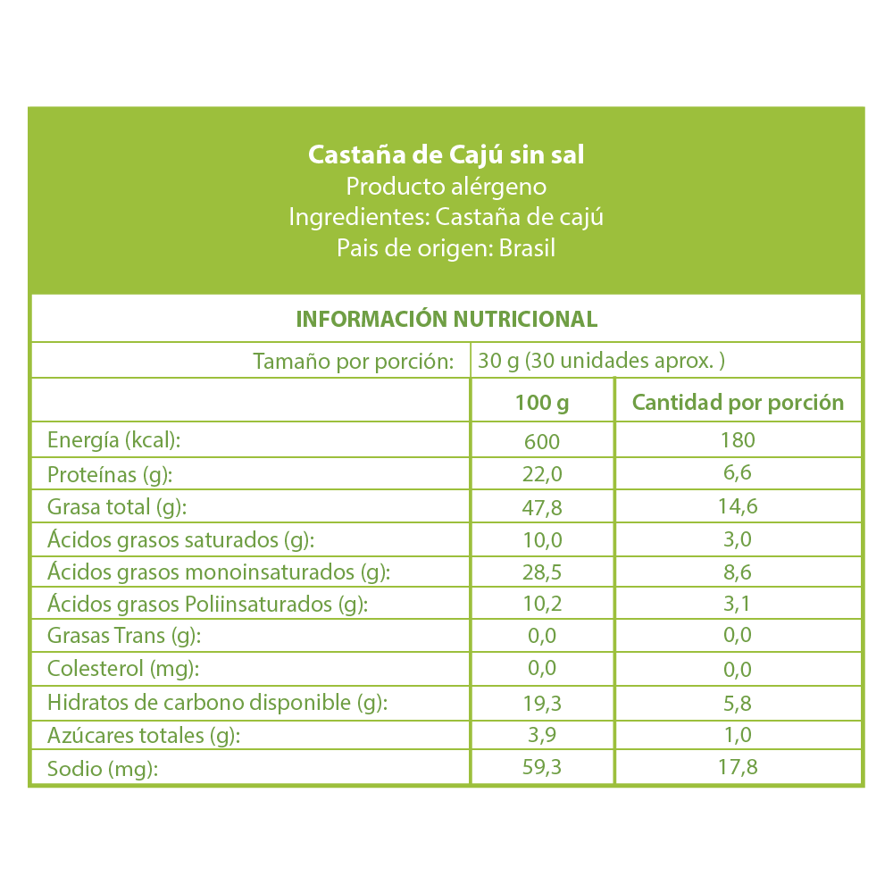 Castañas de Caju cuidadosamente seleccionadas, fruto muy sabroso y nutritivo, se puedo consumir tanto como snack como toppin en diferentes preparaciones,