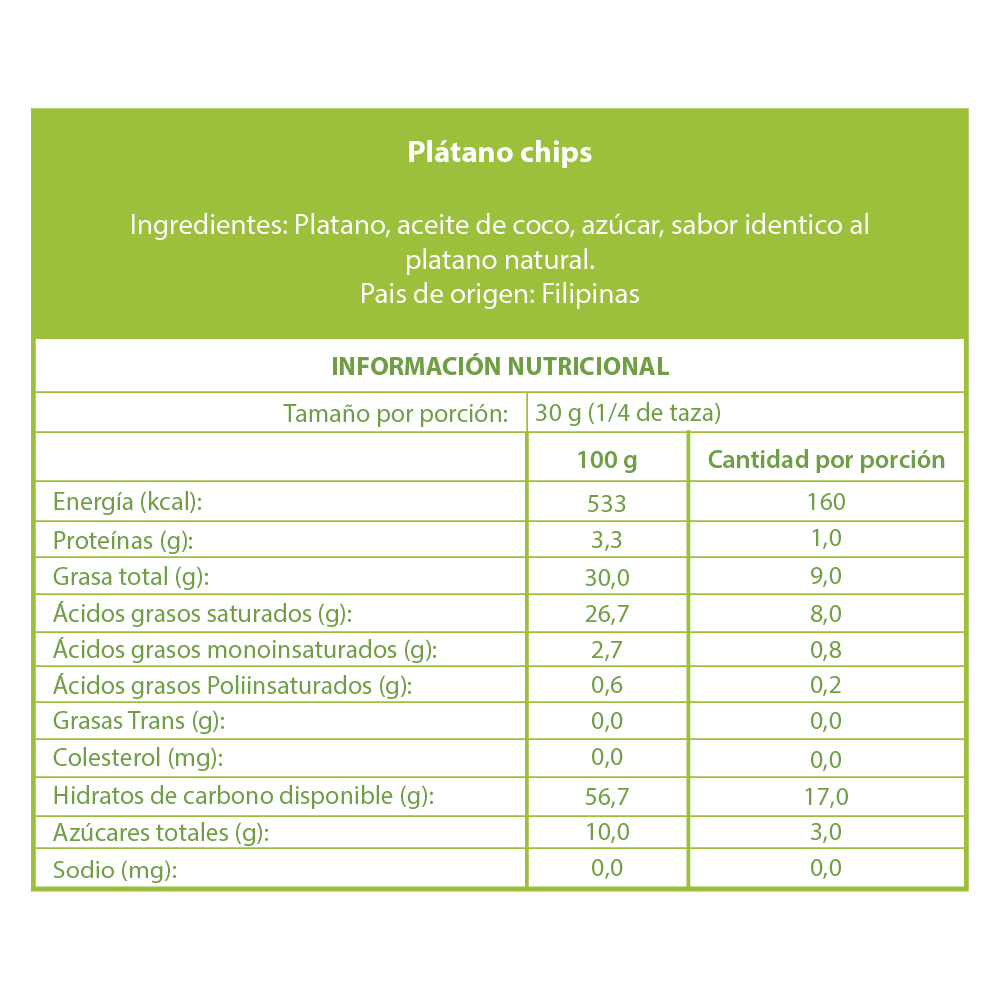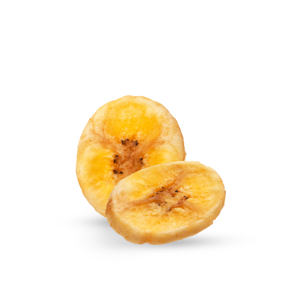 Rodajas de plátano, fritas en aceite de coco y azucaradas, es ideal como snack debido su alto contenido energetico o como toppin en yogur u otros alimentos